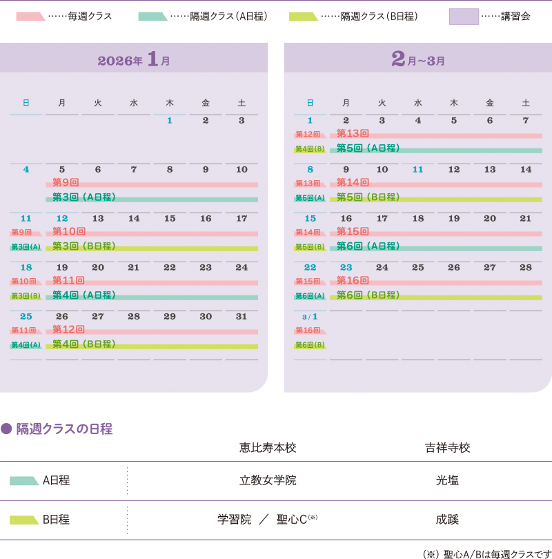 - 【前期-1】毎週クラス:4回/隔週クラス:2回