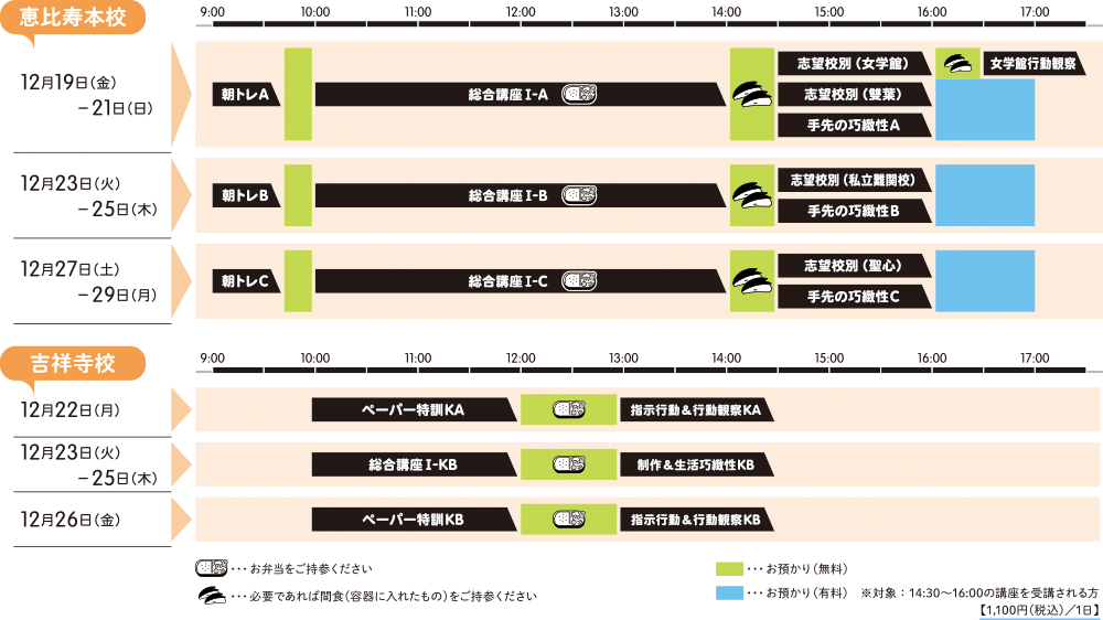 学びに長時間集中して取り組める講習会。この機会を最大限活用していただくために、こぐま会では講座を連続して受講されるお子さまを続けてお預かりいたします。この冬は、ウィークポイントを見逃さず、バランスの取れた総合力の向上に向け、ぜひ効果的な学びに取り組んでいただきたいと思います。