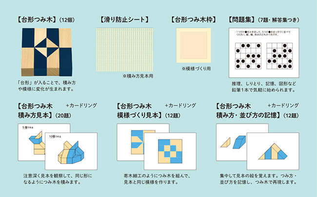 - 台形・長方形・三角形のつみ木を使って形や模様づくり、記憶のトレーニングができます。