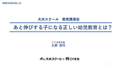 10月12日(日)に、こぐま会のKUNOメソッドを提供している広島の大木スクールを訪問し、今年2回目の講演会を行いました。新年度から年長クラスに通う子どもたちの「学力診断テスト」の実施に合わせ、入試問題の分析とKUNOメソッドの教育内容と方法をお伝えしました。日曜日とあって、お父さまの参加が目立ちました。今回は「あと伸びする子になる正しい幼児教育とは」というテーマで、これから1年間どんな考え方で受験対策を進めればよいのか、私たちの考える指導法をお話しさせていただきました。
