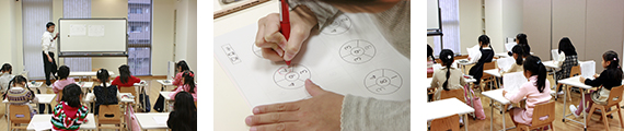 もちろん計算についても力を入れますが、これまでの経験で、20問の問題を解く場合、スピードが速い子で1分、遅い子で5分かかるという具合に、歴然とした差が出てきます。そして時間がかかる原因の多くは、指を使って答えを出そうとすることです。こぐま会では、ばらクラスの時から、指を使わないで数の問題を解く暗算練習に力を入れてきましたが、ここで差がつくのです。どんな方法でも答えが出ればいいと指導されてきた子は、入試に合格してもこうしたところで差が出てしまい、その差は埋まるどころか、これから難しい計算に進めば進むほど差が広がります。幼児期にどんな数の学び方をしてきたか、それはとても大事なことです。 - (F)