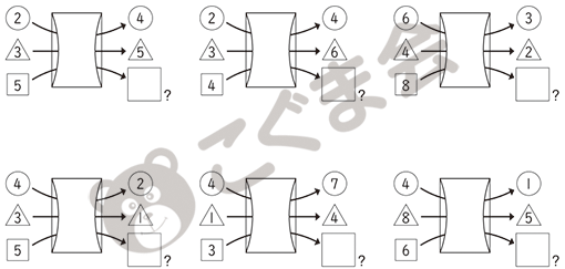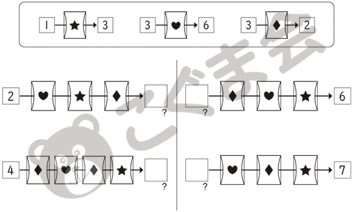 下の左のように箱を通ると数はどのように変わって出てきますか。?のついたお部屋に数をかいてください。右側の問題はどんな数を入れたか考える問題です。?のついたお部屋に数をかいてください。